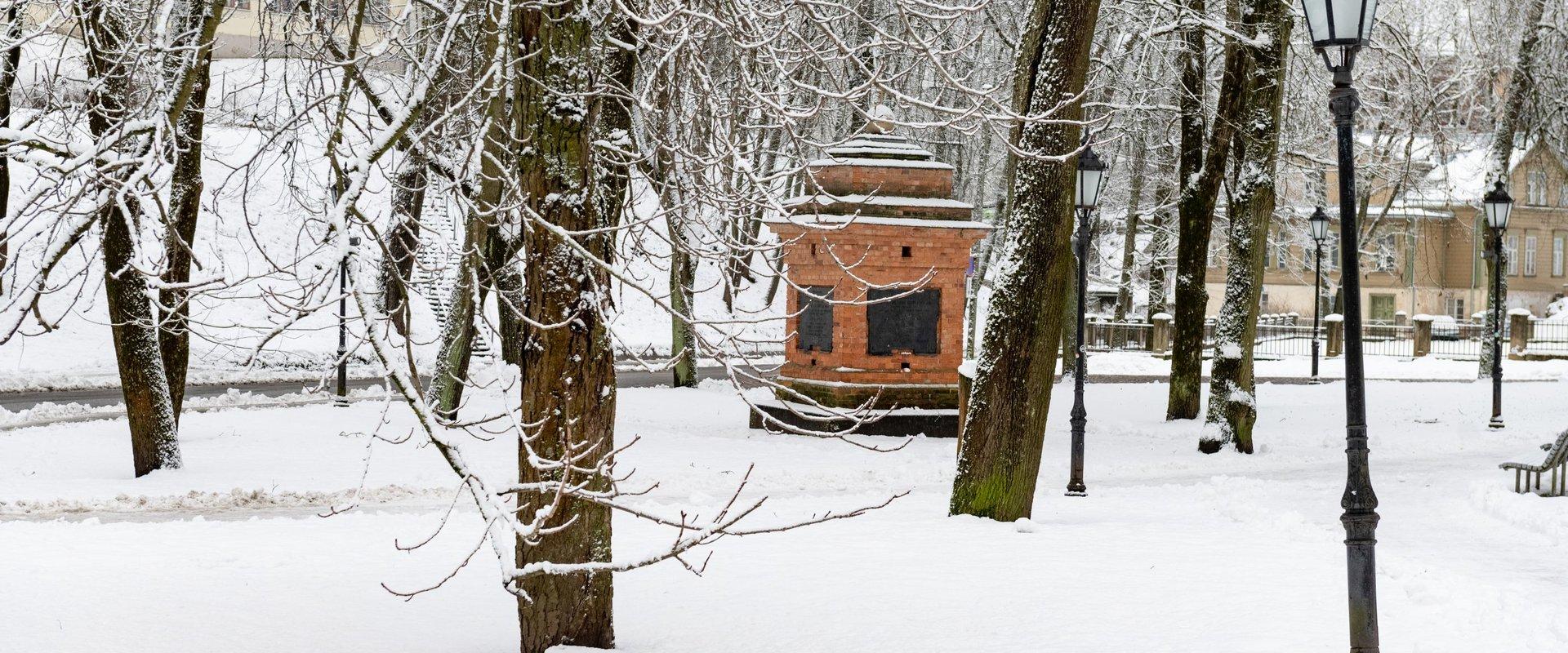 The Monument of Nation is the oldest monument in Tartu. The bones buried under the floor and in the cemetery of St Mary’s Church were found when the main building of the University of Tartu was built on the former site of the church. In 1806 they were reburied in Toomeorg near Vallikraavi Street and the small square Monument to People, which was created according to the drawings of J W Krause and resembles the tomb monuments of Asia Minor (Lykia), was erected there in 1811. The human bones found in the course of archaeological work in the cellars of the main building of the University of Tartu were buried by the monument’s side that faces street on 20 September 1985. A case with information was also buried in the grave.